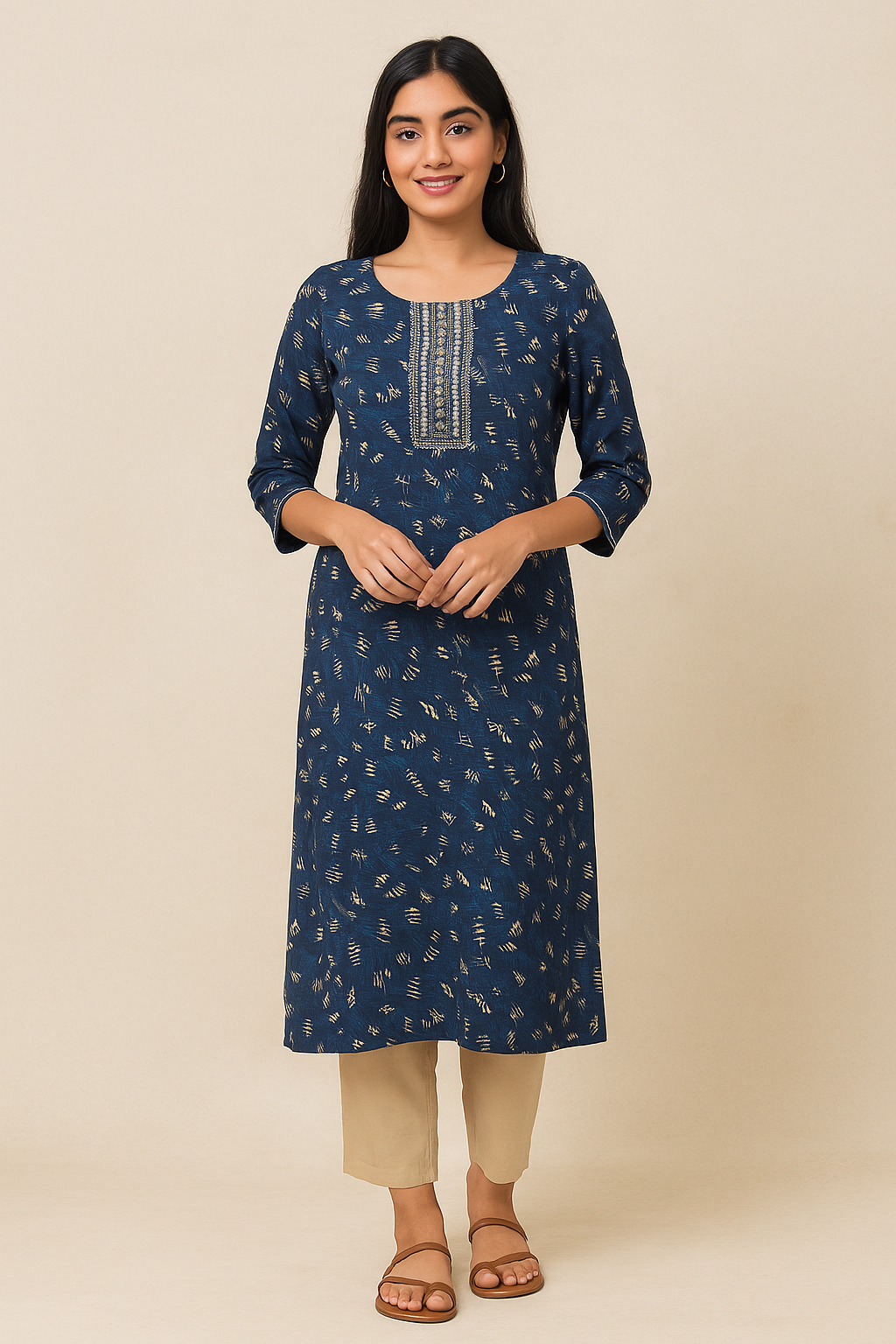 This indigo blue cotton kurti features a beautifully embroidered neckline that enhances its elegant appeal. Designed with 3/4 sleeves, it offers a comfortable fit suitable for various occasions. Crafted from breathable cotton, this kurti combines style and comfort, making it a versatile addition to your wardrobe.