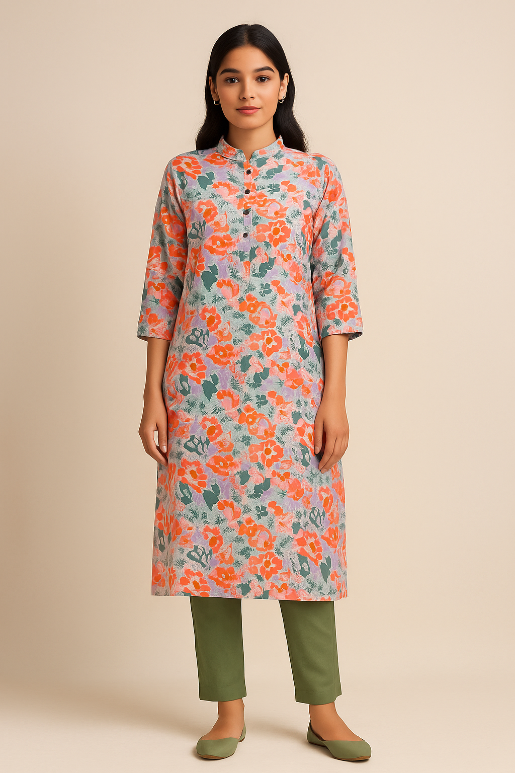 This bright orange kurti features a distinctive Chinese collar and 3/4 sleeves, blending traditional elements with modern style. Crafted from breathable fabric, it offers comfort and ease for daily wear while making a vibrant statement. Its tailored design ensures a polished look suitable for various occasions.