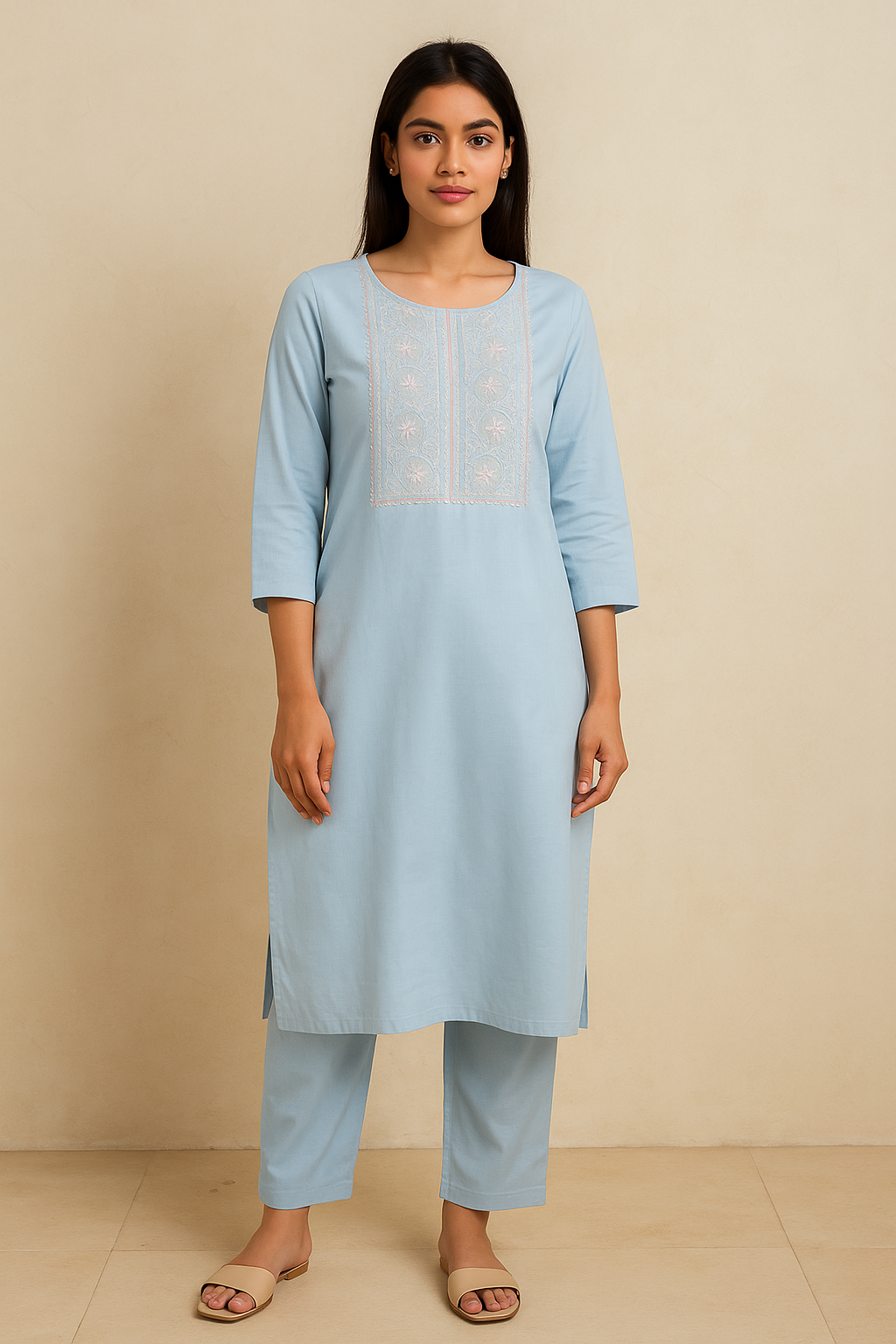 This sky blue cotton kurti features elegant thread embroidery on the neckline and 3/4 sleeves, combining delicate detailing with comfortable design. Made from breathable cotton, it offers a fresh and refined look suitable for both casual and formal occasions.